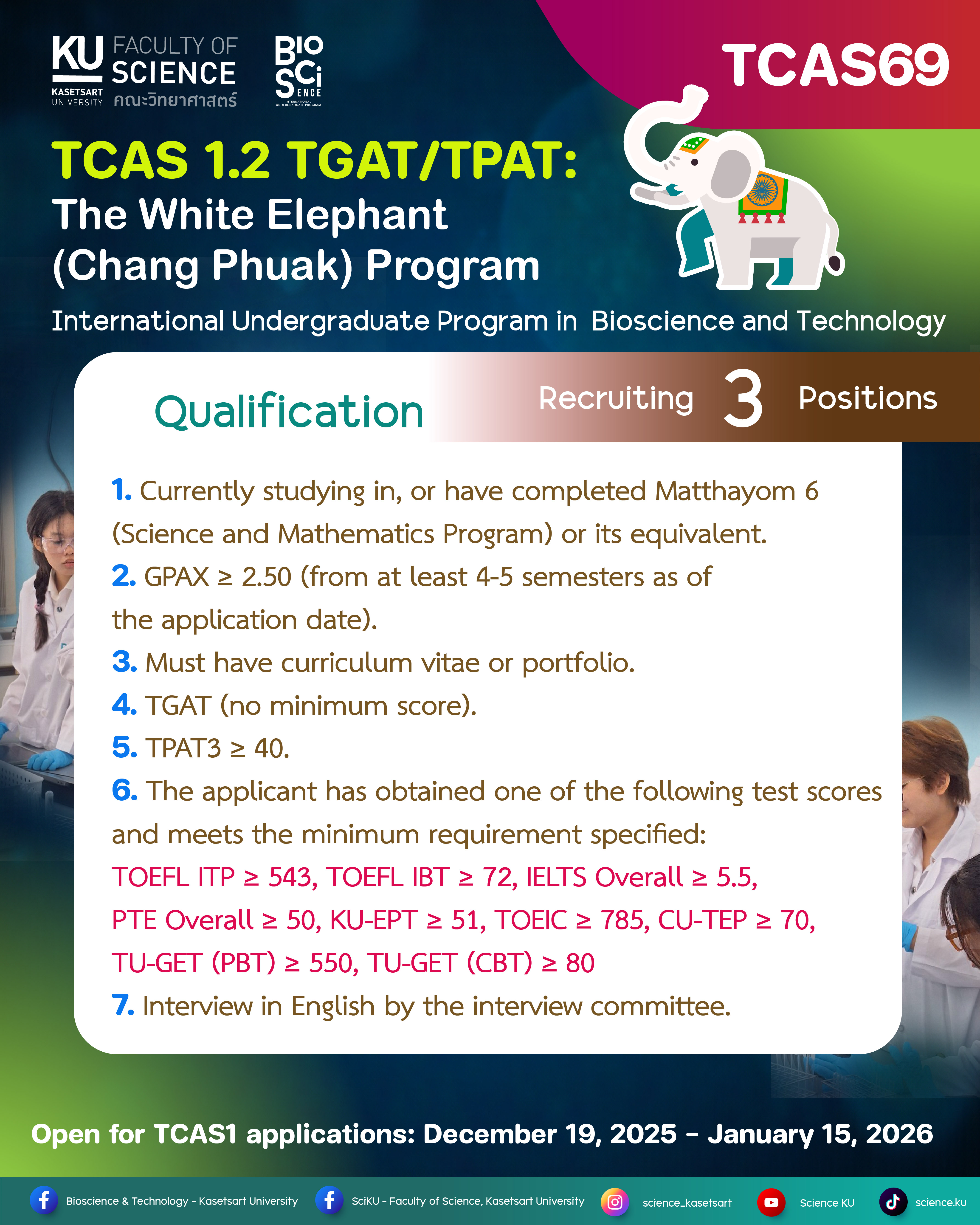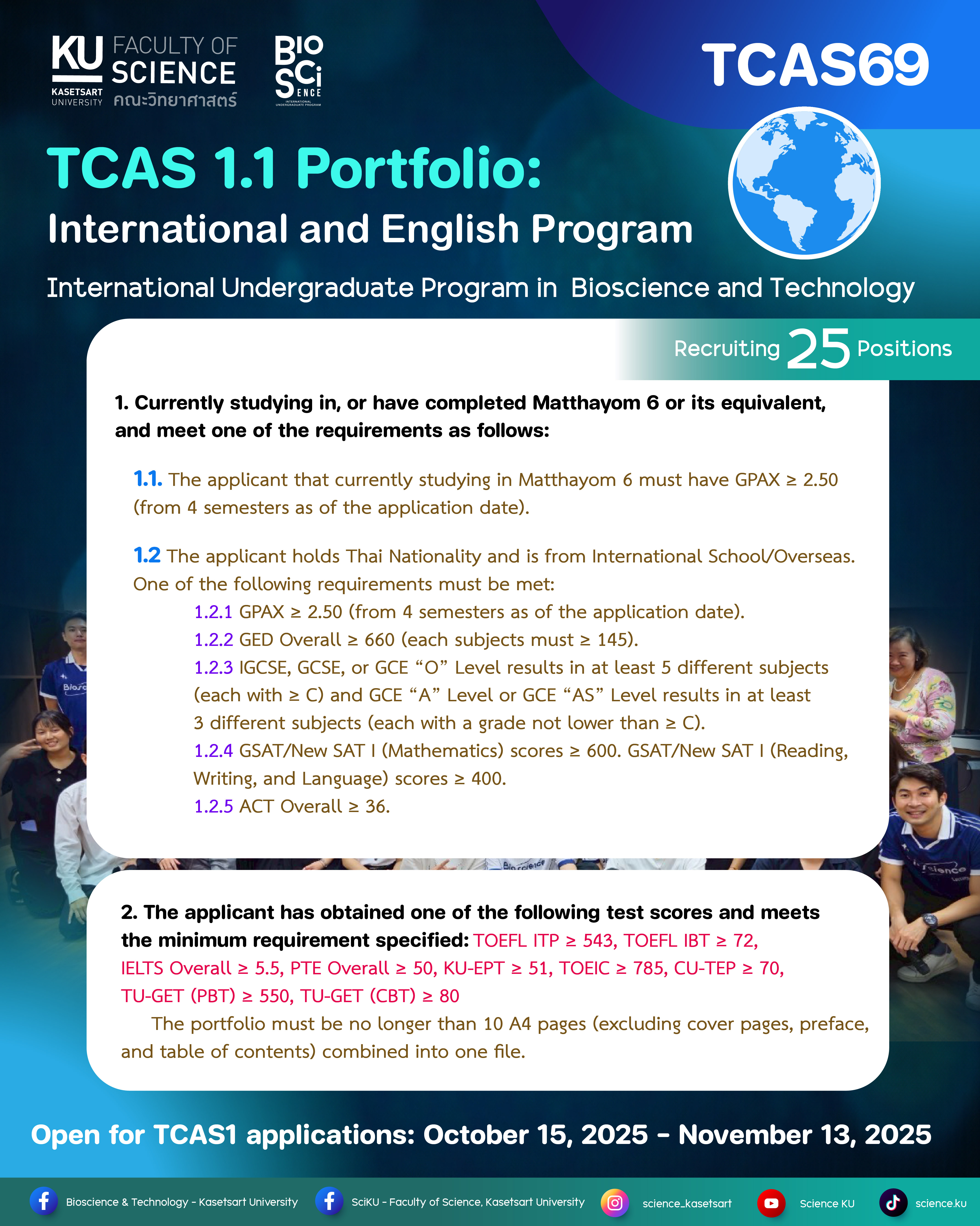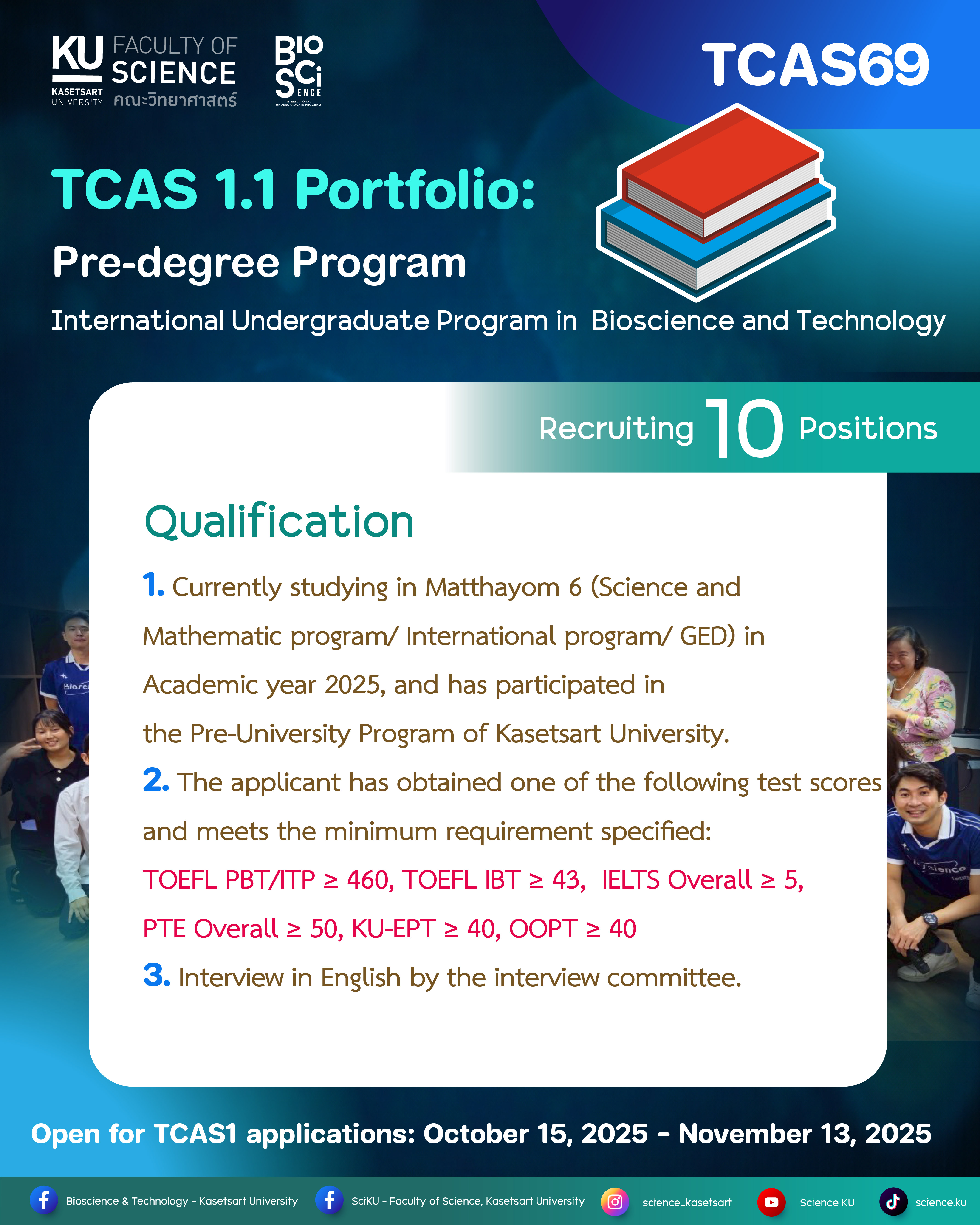 Complete 12 years of schooling or equivalent to M6 in Thailand. Proficiency must be demonstrated in English, Mathematics and Science. More information is available at the KU TCAS69 system (https://admission.ku.ac.th/).