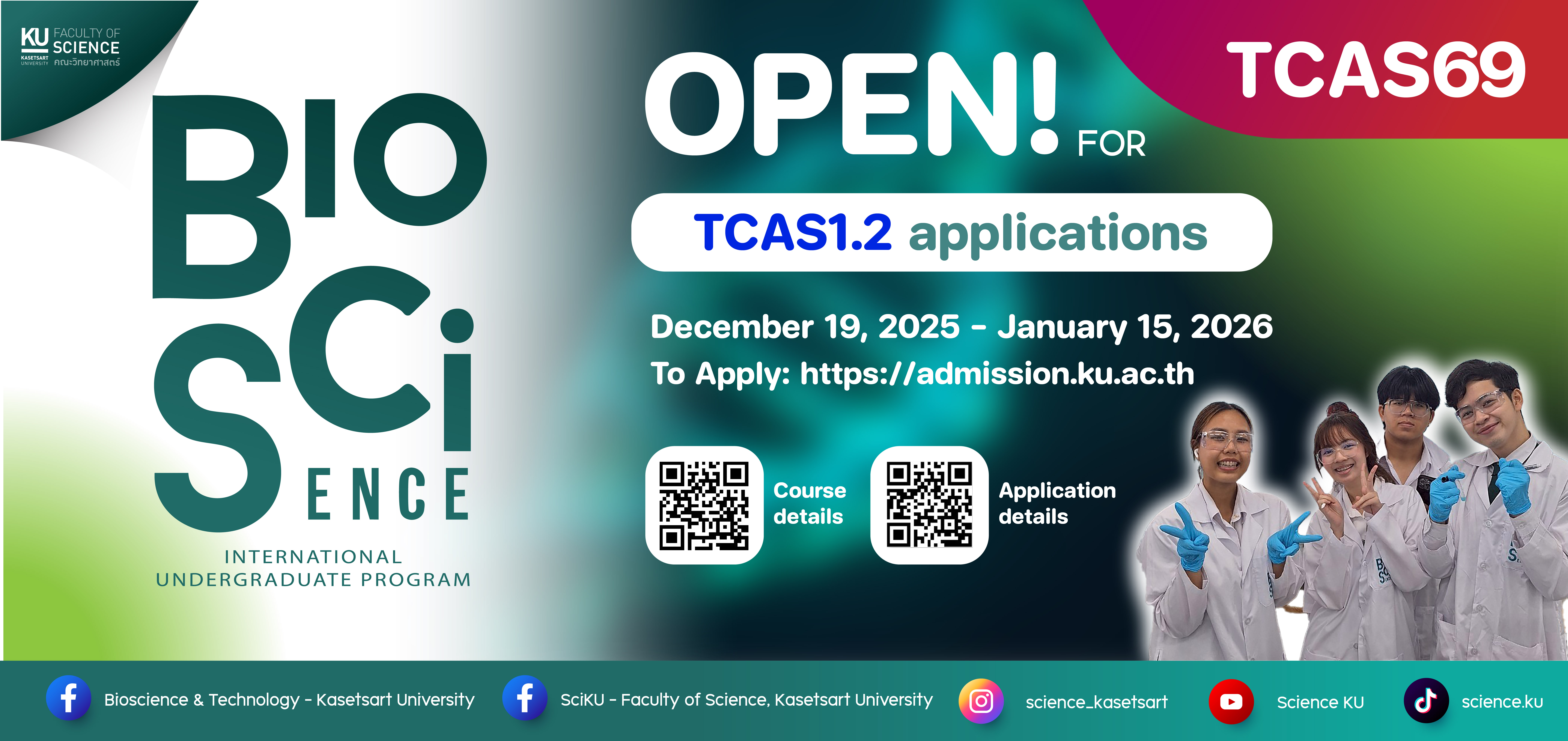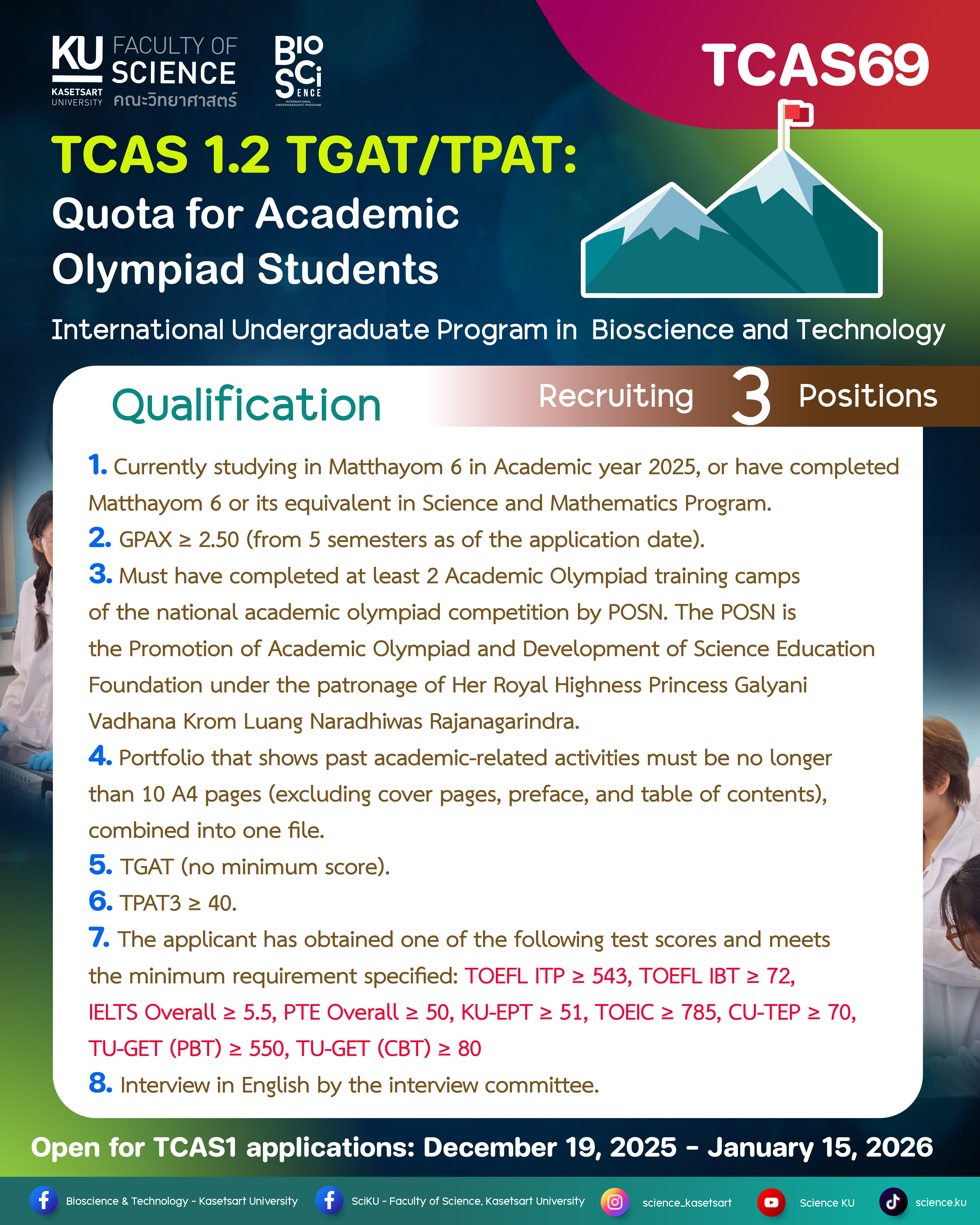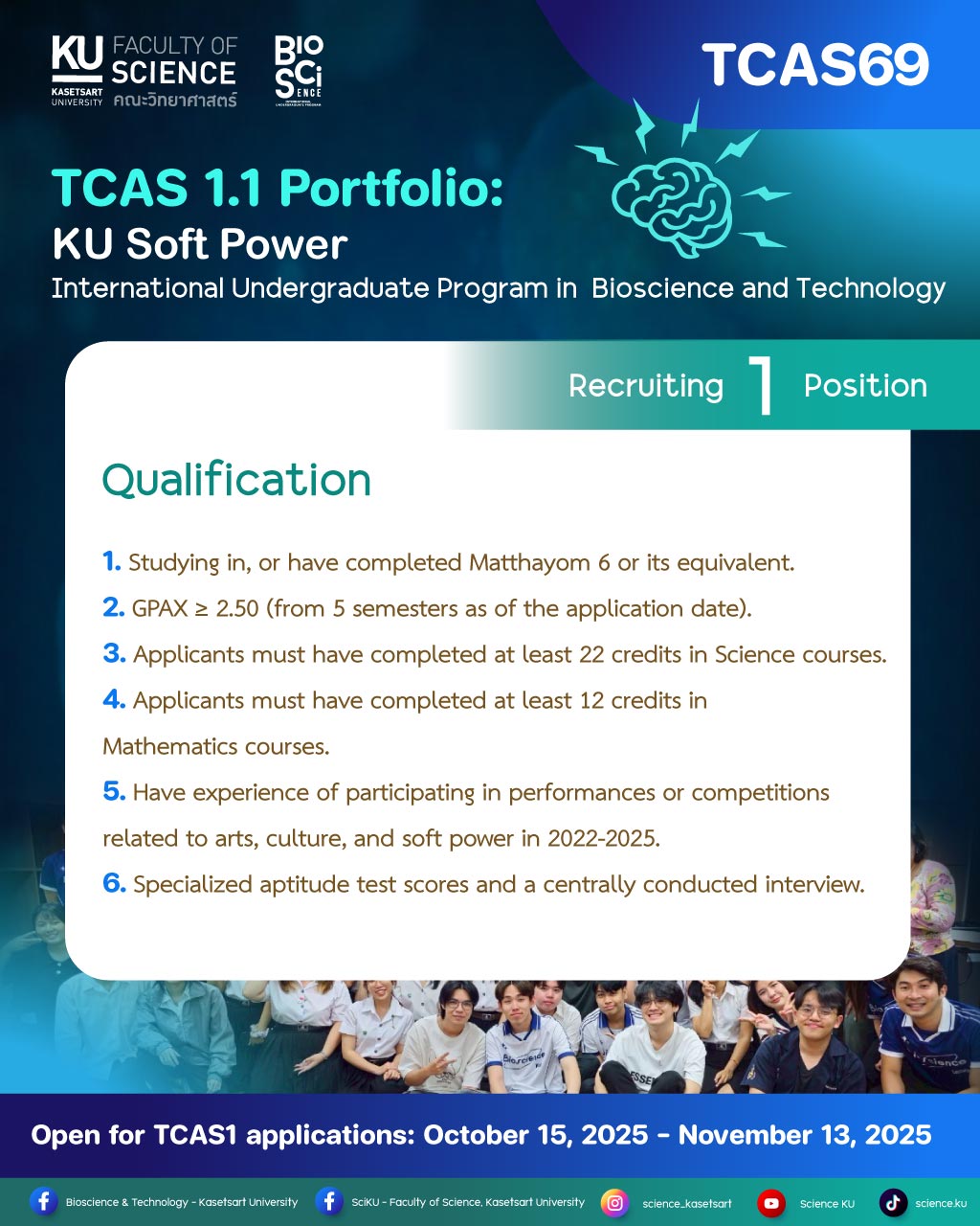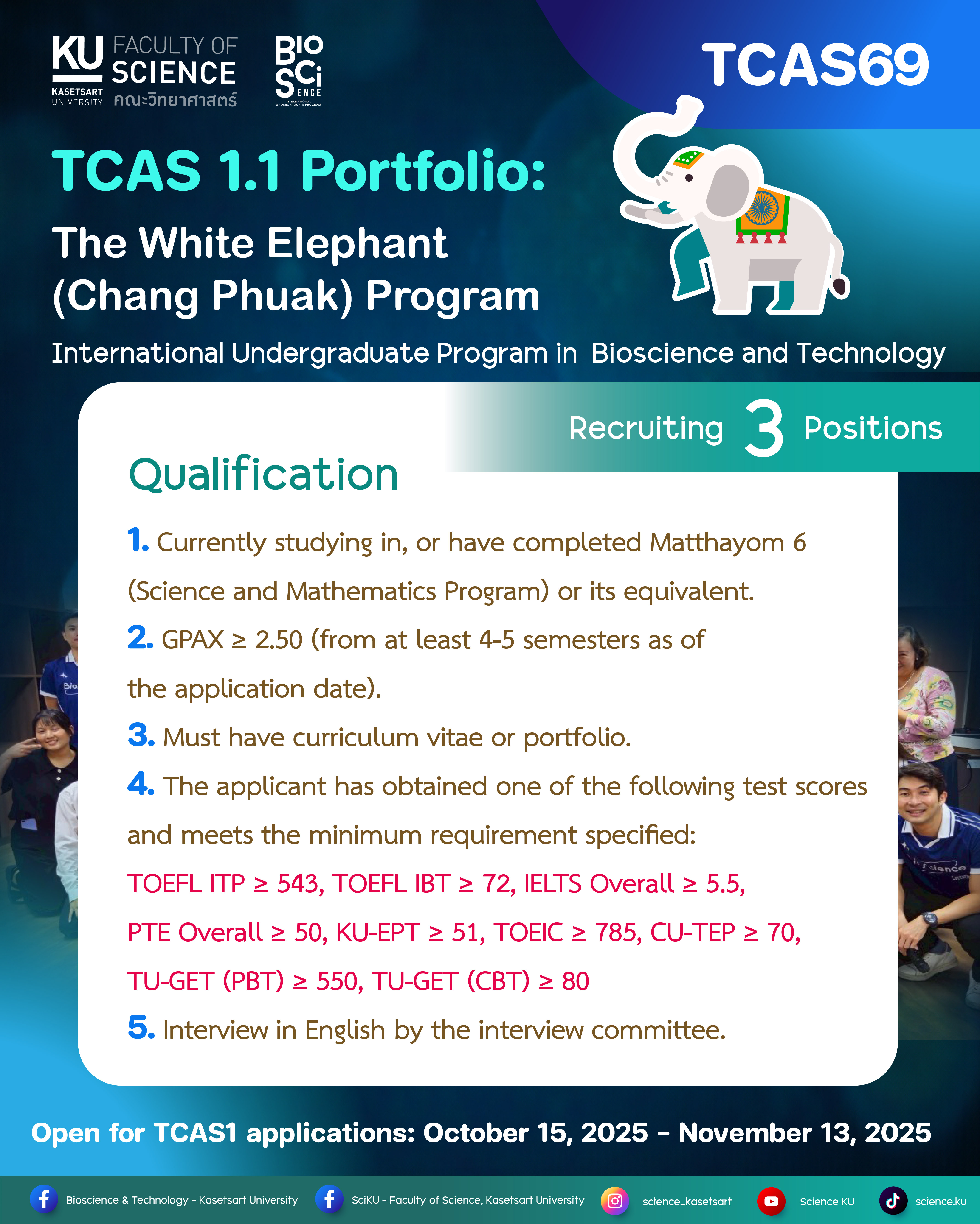 Complete 12 years of schooling or equivalent to M6 in Thailand. Proficiency must be demonstrated in English, Mathematics and Science. More information is available at the KU TCAS69 system (https://admission.ku.ac.th/).